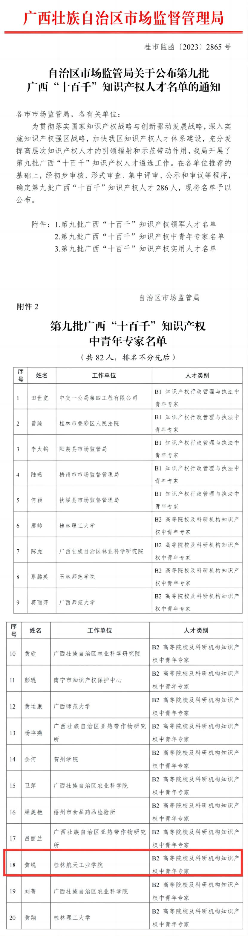 近日,自治区市场监管局发布《关于公布第九批广西“十百千”知识产权人才名单的通知》(桂市监函〔2023〕2865号),我校黄锐教授入选广西“十百千”知识产权中青年专家。这是我校首次申报并入选广西“十百千”知识产权人才。