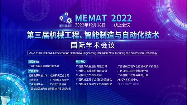 12月18日,由广西壮族自治区科学技术协会指导,在广西机械工程学会的大力支持下,我校联合桂林电子科技大学、河池学院、广西制冷学会、广西太阳能协会、广西制造系统与先进制造技术重点实验室主办,AEIC学术交流中心承办的第三届机械工程、智能制造与自动化技术国际学术会(MEMAT2022)在线上顺利举行。广西机械工程学会理事长、桂林电子科技大学副校长潘开林出席会议并为大会致辞。会议由学会常务副理事长高兴宇主持。