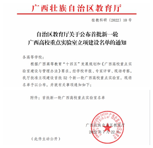 近日,教育厅下发《自治区教育厅关于公布首批新一轮广西高校重点实验室立项建设名单的通知》,我校申报的“广西高校无人机系统与技术应用重点实验室”、“广西高校特种工程装备设计与智能驱动技术实验室”、“广西高校智能检测与信息处理实验室”、“广西高校清洁能源装备与节能技术重点实验室”等4个重点实验室获批立项建设,同时,我校也是区内同类本科院校获批数量最多的高校。