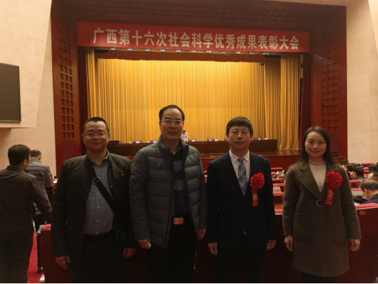 2020年12月1日,广西第十六次社会科学优秀成果表彰大会在南宁市自治区党委礼堂隆重召开。我校张立国教授的专著《效率视角下中国物流业能源消耗与二氧化碳排放研究》获广西第十六次社会科学优秀成果著作类三等奖,刘思彤老师撰写的论文《知识图谱视角下我国民族地区舆情研究演化与热点分析》获广西第十六次社会科学优秀成果论文类三等奖,两人作为获奖代表受邀参加本次表彰大会。我校党委副书记刘迎春、学校社科联秘书长黄涛作为获奖单位代表参加了表彰大会。