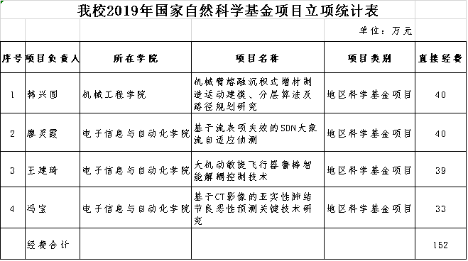 8月16日,国家自然科学基金委员会公布2019年度国家自然科学基金申请项目评审结果,我校喜获4项地区科学基金项目,共获资助经费152万元,立项数和资助经费均取得历史性突破。
