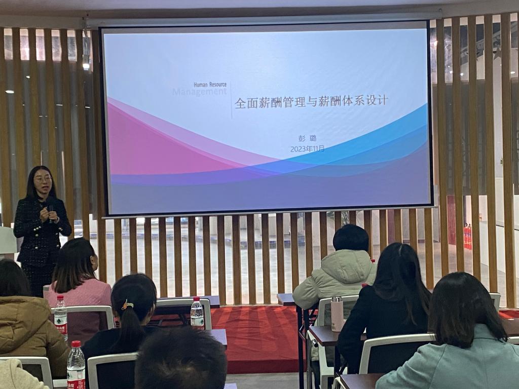 彭璐老师首先讲解了薪酬绩效管理的概念、薪酬组成要素与应用方法、薪酬模式与方案设计等内容,然后与参会企业代表进行了良好互动,解答了多个薪酬绩效问题。