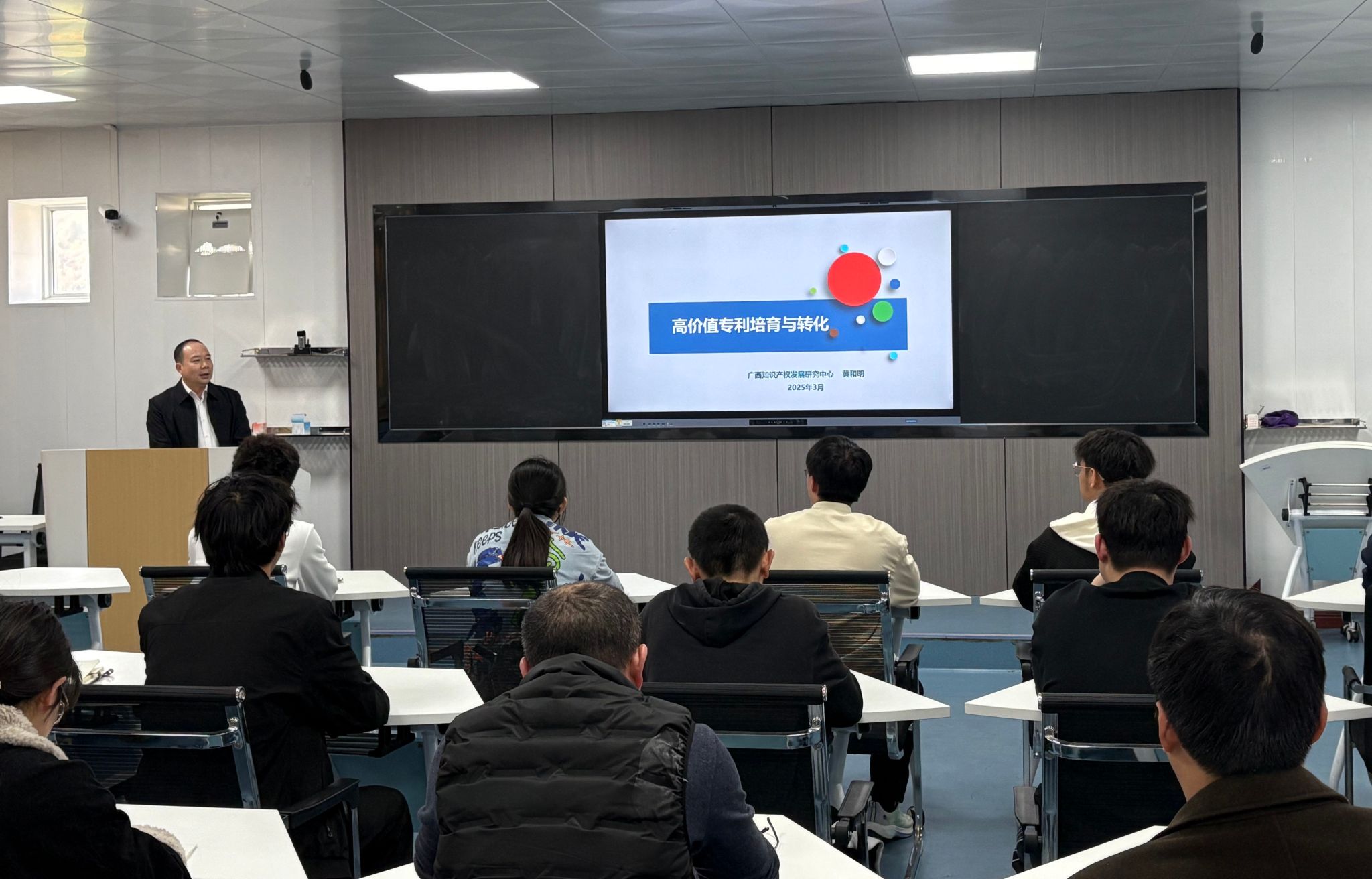 3月21日下午,我校邀请广西知识产权发展研究中心主任黄和明,来校为师生做题为“高价值专利培育与转化”专题讲座。二级学院师生代表、科研创新团队成员、有意向进行专利转化的教师约30余人到场聆听讲座。