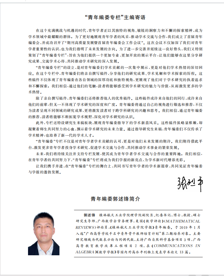 三、栏目创新:聚焦学术前沿与科研活力。新版学报在栏目设置上推陈出新,新增“青年编委专栏”,为青年学者搭建展示学术成果的平台,激发学术创新活力。同时,学报发布了2025年重点选题指南,并开设“人工智能+制造”专栏,聚焦前沿科技与产业融合。自然科学类栏目涵盖“航空航天研究”“工程技术与应用”等主题专栏,优先刊发创新性强、时效性高的应用性研究成果;人文哲社类栏目包括“航天文化研究”“低空经济研究”“人工智能+高等教育”等,注重学术深度与实践价值的结合。