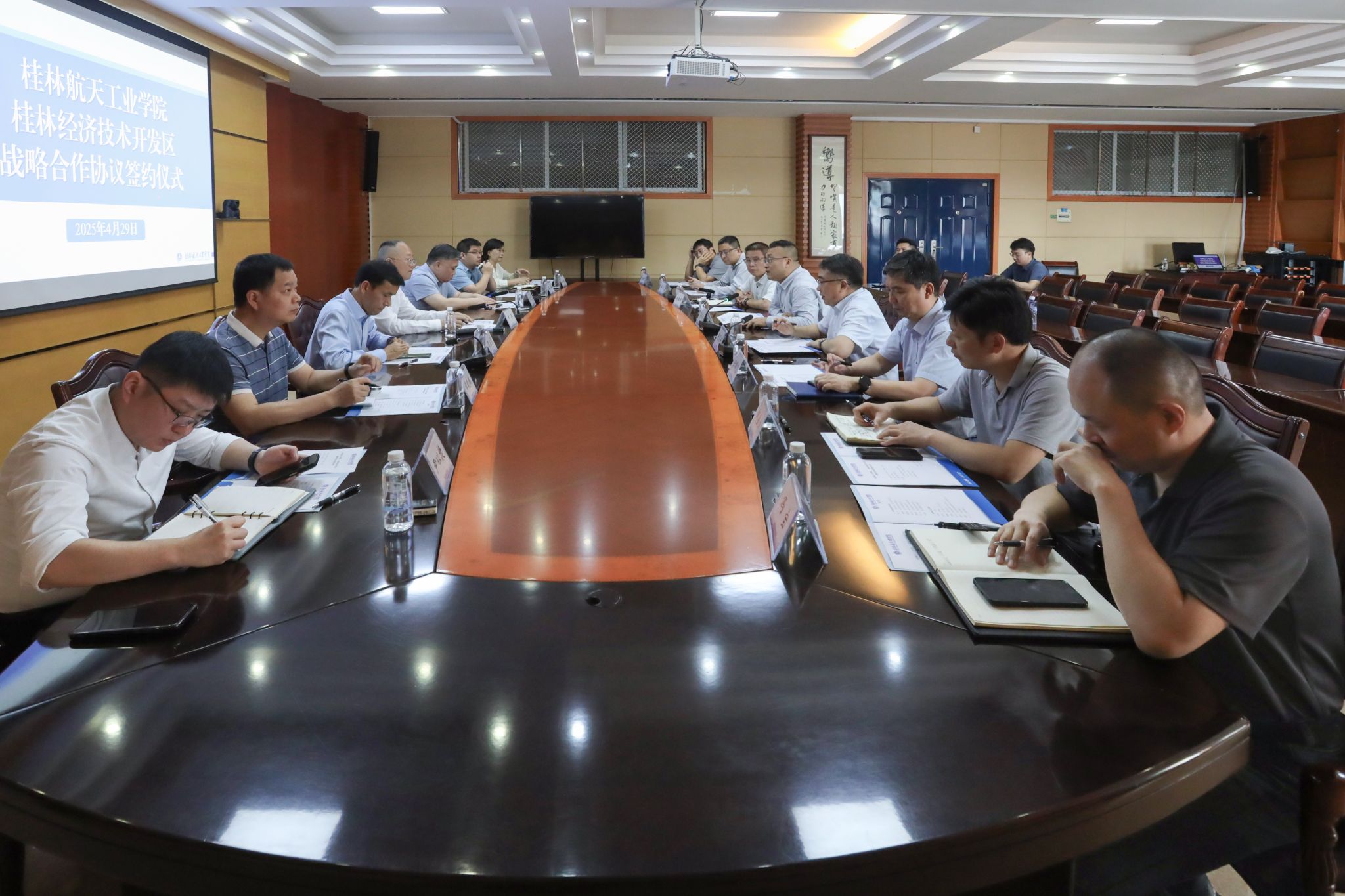 为推动校政合作、产教融合,服务桂林经济社会高质量发展,4月29日下午,我校与桂林经济技术开发区在飞天楼517会议室举行战略合作协议签约仪式。临桂区区长、经开区管委会主任何兵,校长吴尽昭,副校长张烈平及双方有关单位负责同志出席签约仪式并进行座谈。