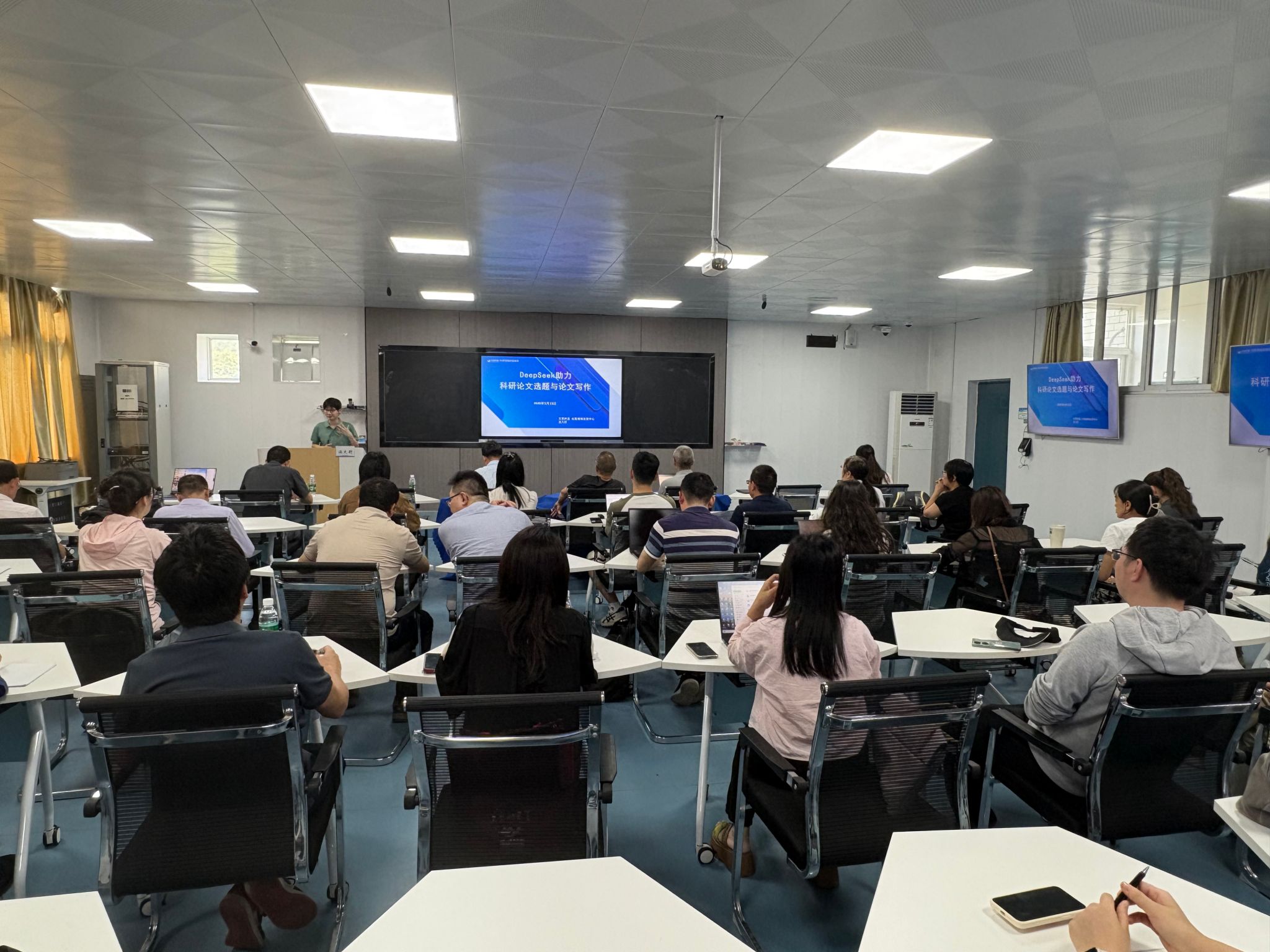 近日,我校在南校区飞天楼 402 智慧教室成功举办“DeepSeek 助力科研论文选题与写作”学术讲座。本次讲座由艾思科蓝出版编辑部总监温大尉博士担任主讲嘉宾。